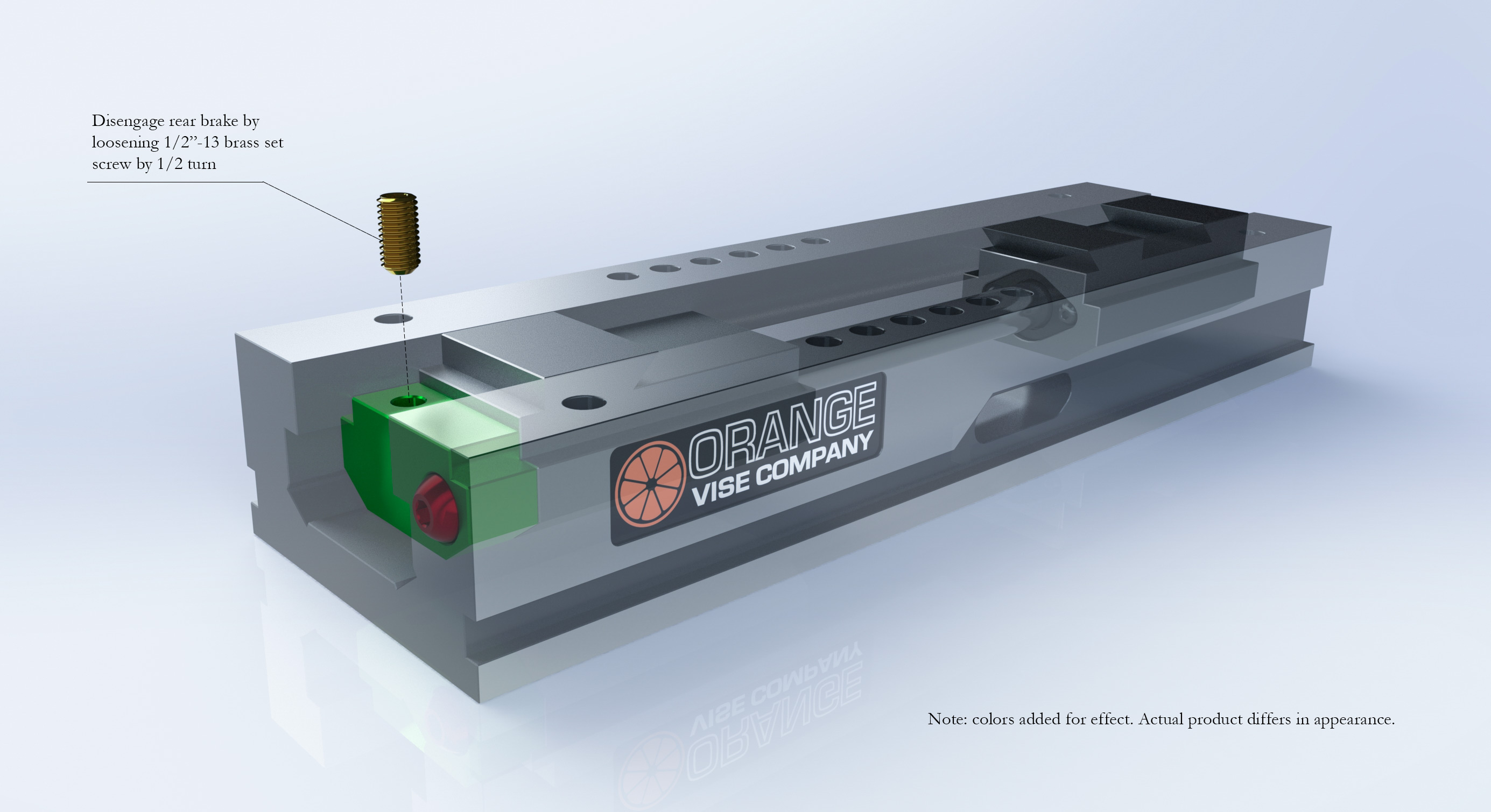 The brake, aka the "third hand mechanism", is a simple spring-loaded stop block that acts as a travel limiter for the rear sliding jaw. To start, disengage the brake by loosening the brass 1/2"-13 x 1" set screw by 1/2 turn.